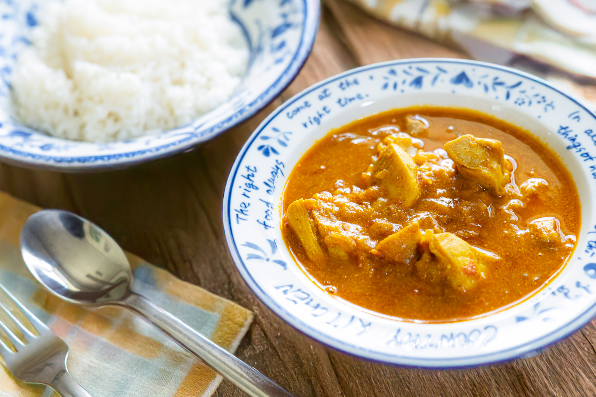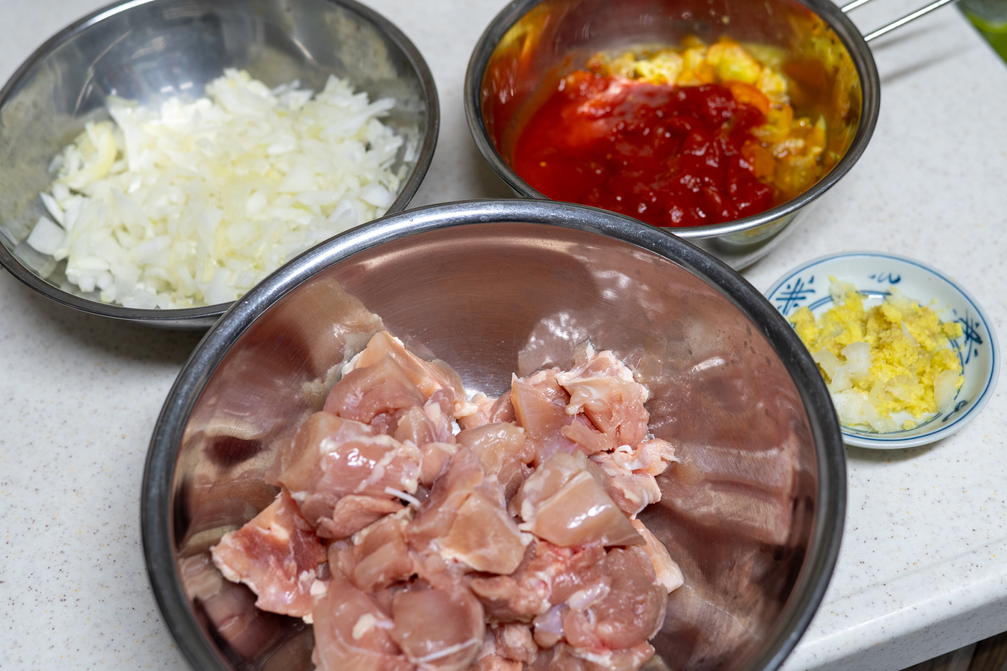 商品としてはごくシンプルで、スパイスミックスと呼ばれるカレー粉が入っているのみですが、これがコリアンダー、ウコン、クミン、ブラックペッパー、パプリカパウダーなどを調合した本格スパイス。パッケージにトマト缶でつくるチキンカレーと、海老とココナッツミルクでつくるシュリンプカレーの2種類のレシピが書かれていますが、今回は冷蔵庫の中と相談してチキンカレーをつくることにします。