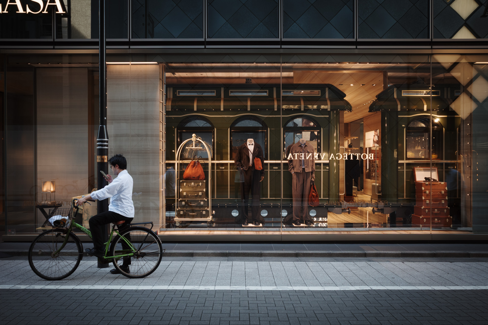 ボッテガ・ヴェネタは、イタリアを代表する高級ラグジュアリーブランド。まあ私のような庶民には一生縁のないブランドなわけですが、ウインドウだけよりも、自転車止めてスマホ見ているおっちゃんとの2ショットのほうがむしろフォトジェニックでは、という話。