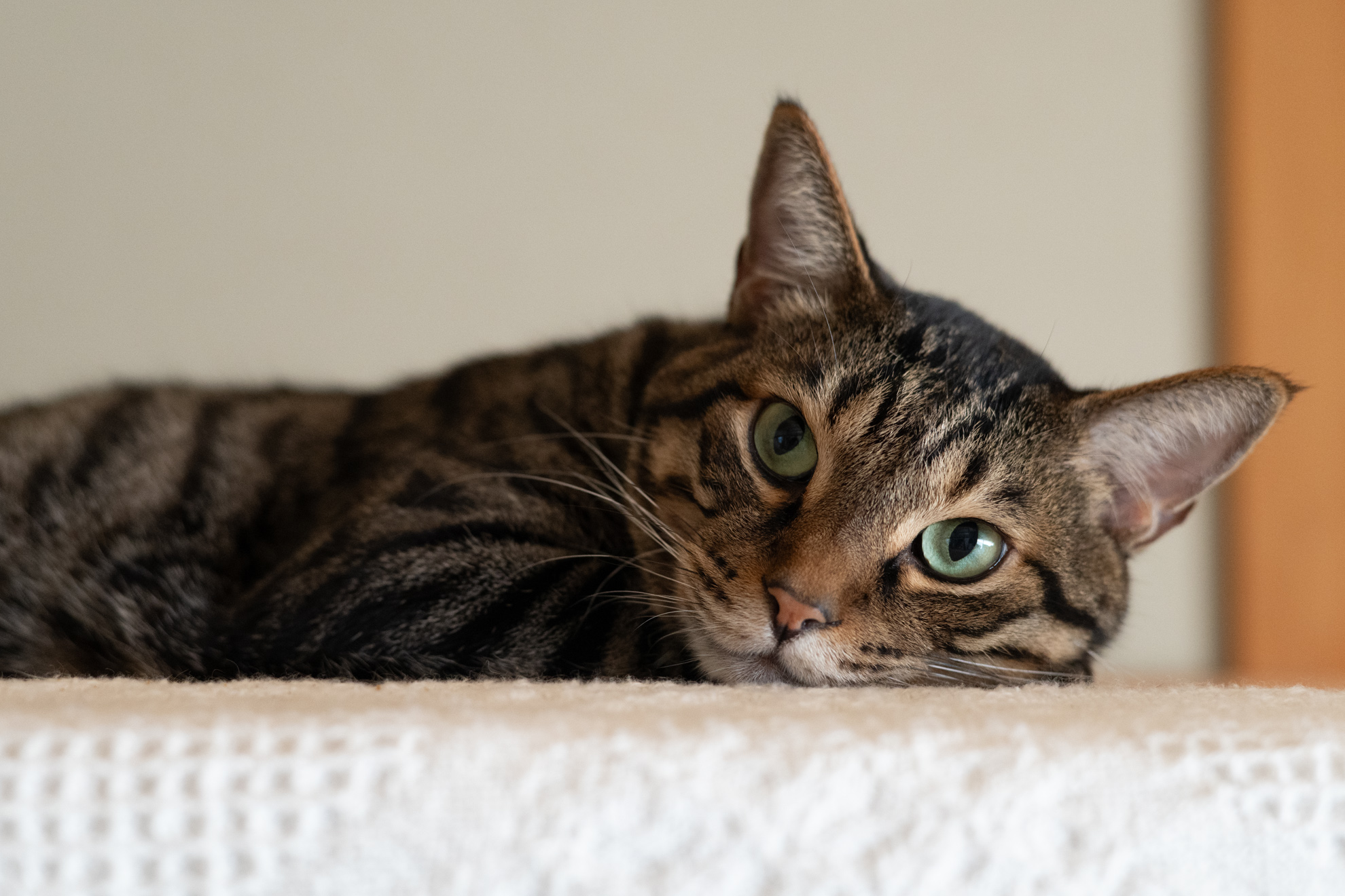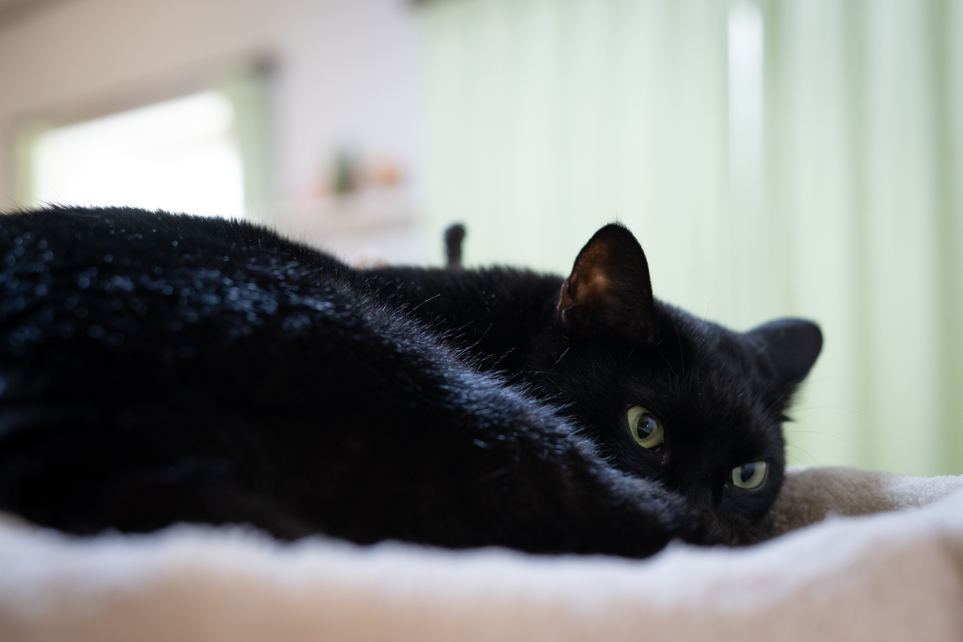 うちのねこさんたちはすっかり撮影慣れしていてどんなに近付いても逃げたりしませんが、50mmのレンズで狙うと適度に離れた場所からちょうど上半身アップくらいの写真が撮れて、今更ですがこの距離感ちょうどいいかもと思うのです。大口径の単焦点レンズなら背景ボケの演出もばっちりですしね。