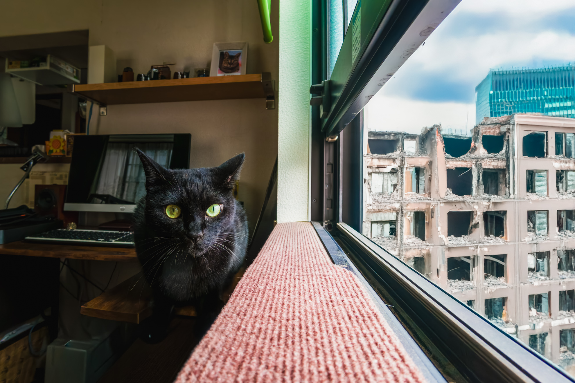 超広角のAceProに近接撮影を実現させるクローズアップフィルターを装着して撮影したら、自分でも想定していなかったアングルの写真が撮れたので、その中の一枚から窓の外の景色をAI生成して作品を作ってみました。廃墟の街に住む猫、みたいなイメージですがいかがでしょう。