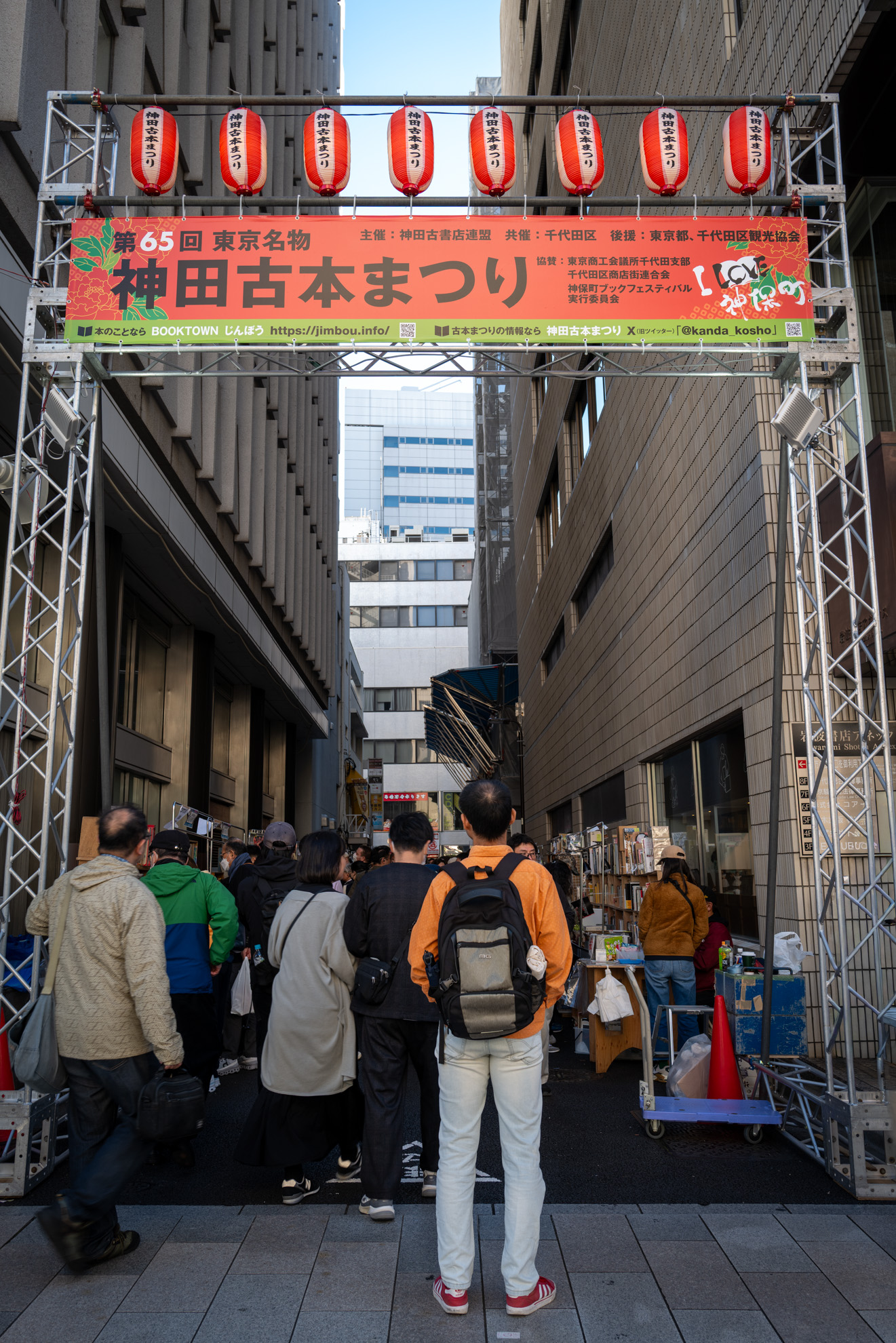 地下鉄神保町駅の階段を上ると、靖国通り沿いには100台は超えるかという数のワゴンに並べられた本・本・本。もともとこの道沿いで営業している書店と書棚に囲まれ、約500mにおよぶ「本の回廊」が出現します。