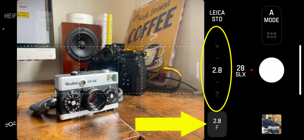 尚、絞り値をどうやって変更するかというと、画面下部の矢印の場所、F値が表示されている部分をタップすると、メーターが絞り値に切り替わります。