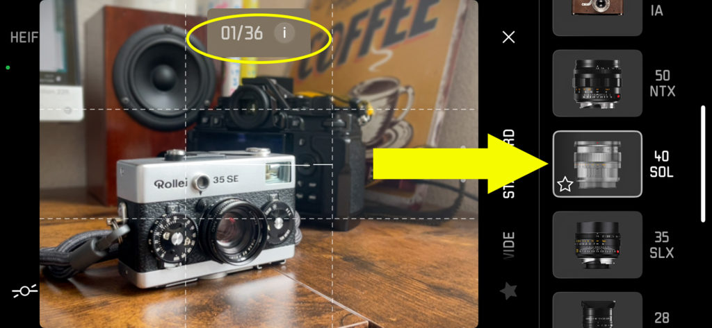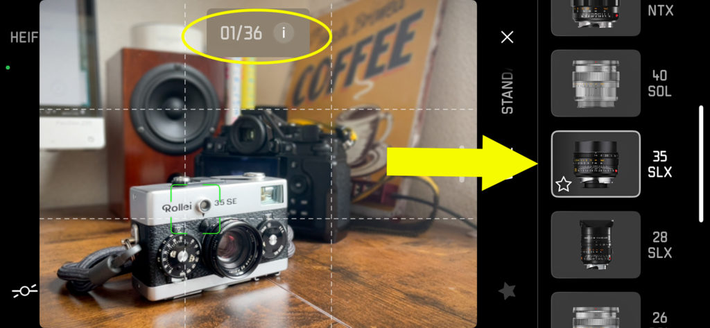 あらためて35mmズミルクスを選ぶと、モニター上部に01/36の数字が。