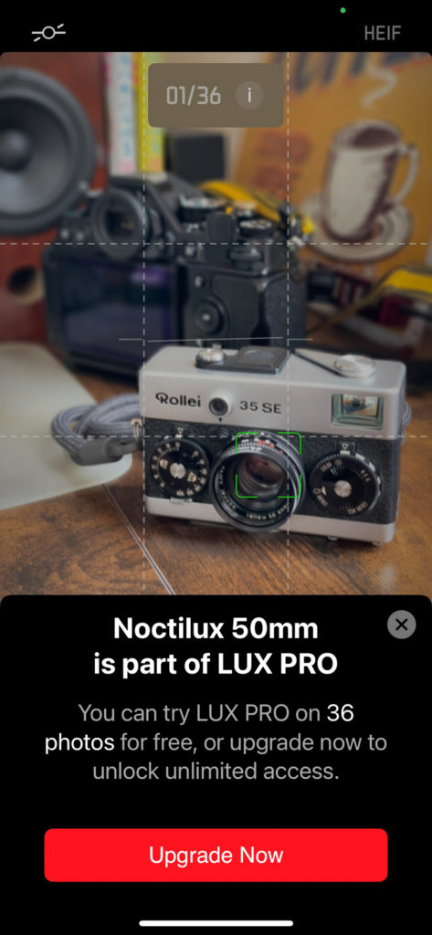 アップデート後大喜びでノクチルクス50mmで1枚撮ったところ、すかさず何かメッセージが表示されました。英語なので落ち着いて訳してみると、えーと「ノクチ50mmはLUX PROの機能です / PRO機能は36枚分だけ無料で使えます / または下記ボタンからアップグレードしてね(超訳)」