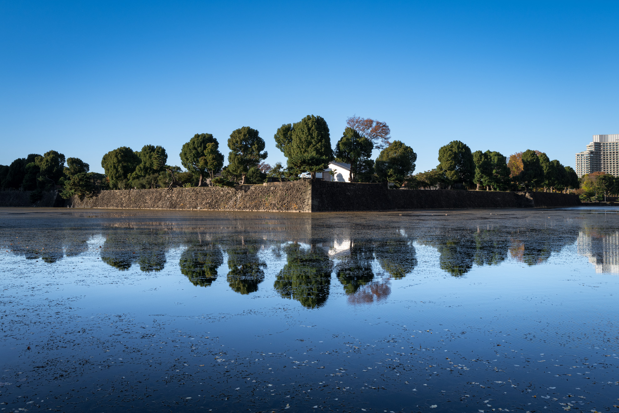 皇居のお濠の中でも、水面に景色が反射するリフレクション撮影スポットとして知られているのが日比谷濠。これまでも何度か撮影していますが、今回は皇居側の反射がなんだか幾何学的でいい感じ。