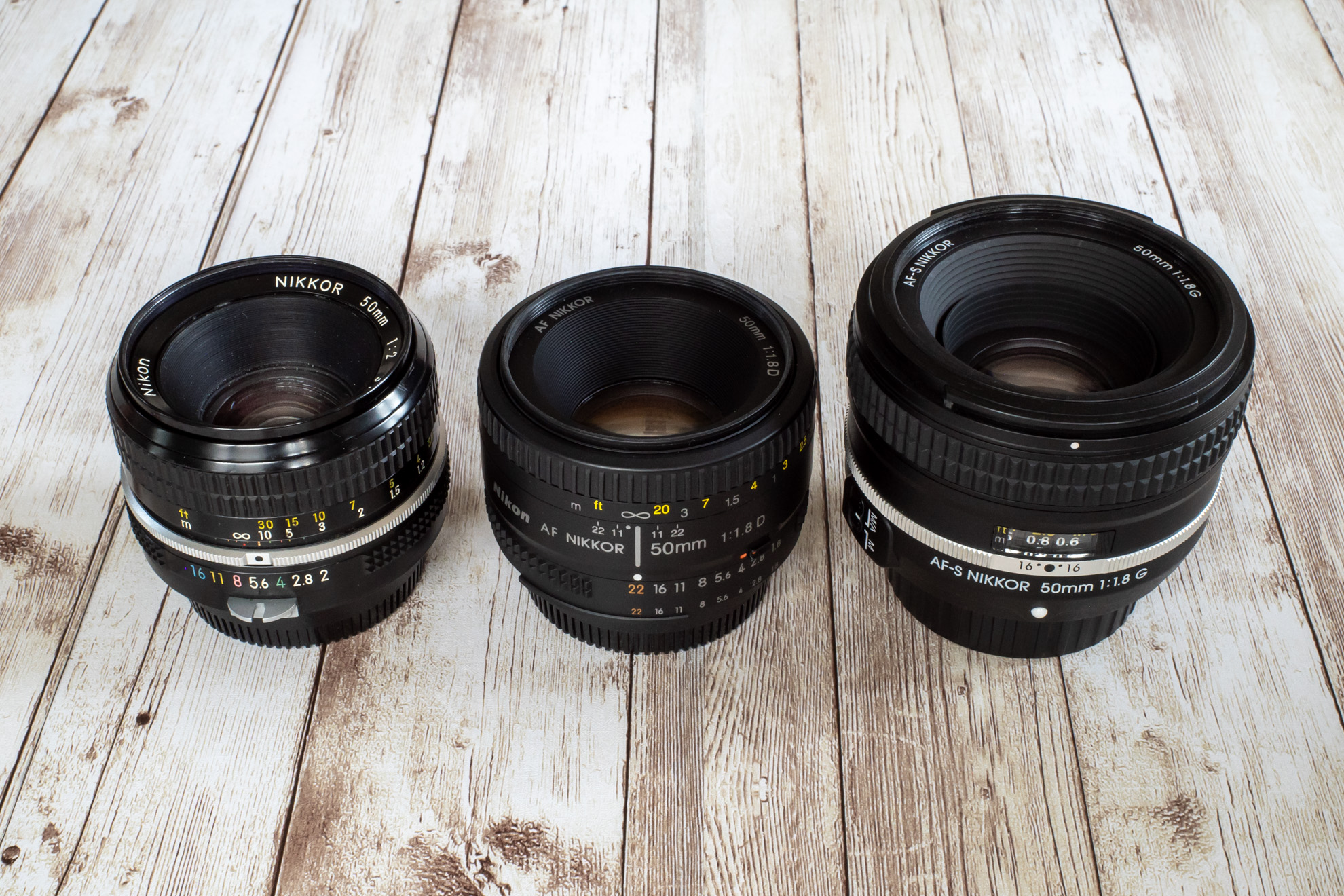 まずは3台をエントリーしておきましょう。左から(古いほうから)、New Nikkor 50mm F2 → Ai AF Nikkor 50mm F1.8D → AF-S NIKKOR 50mm f/1.8G Special Editionの3本です。