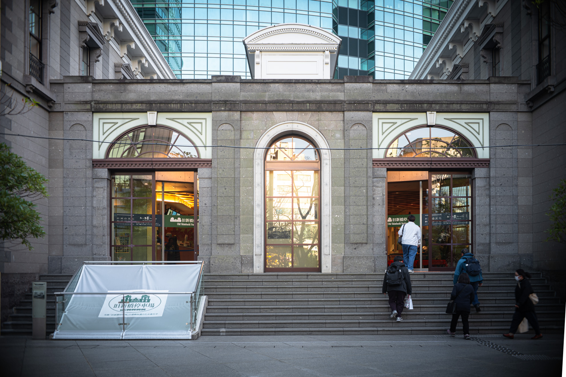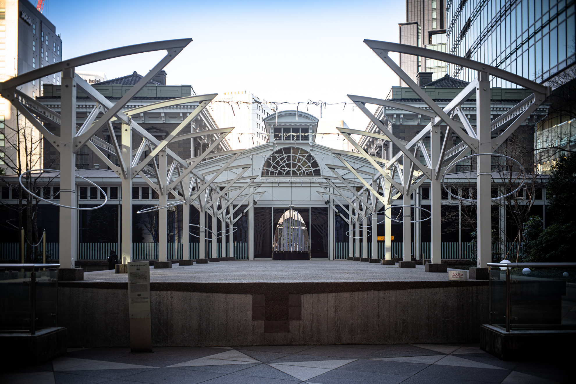 カレッタ汐留の向い側に位置する、鉄道開業当時の新橋駅を復元した旧新橋停車場も撮影しておきましょう。これも以前撮影していますけれども、オールドレンズで撮るとガラスに当たった西日がふわっと滲んで少し違った雰囲気に感じます。