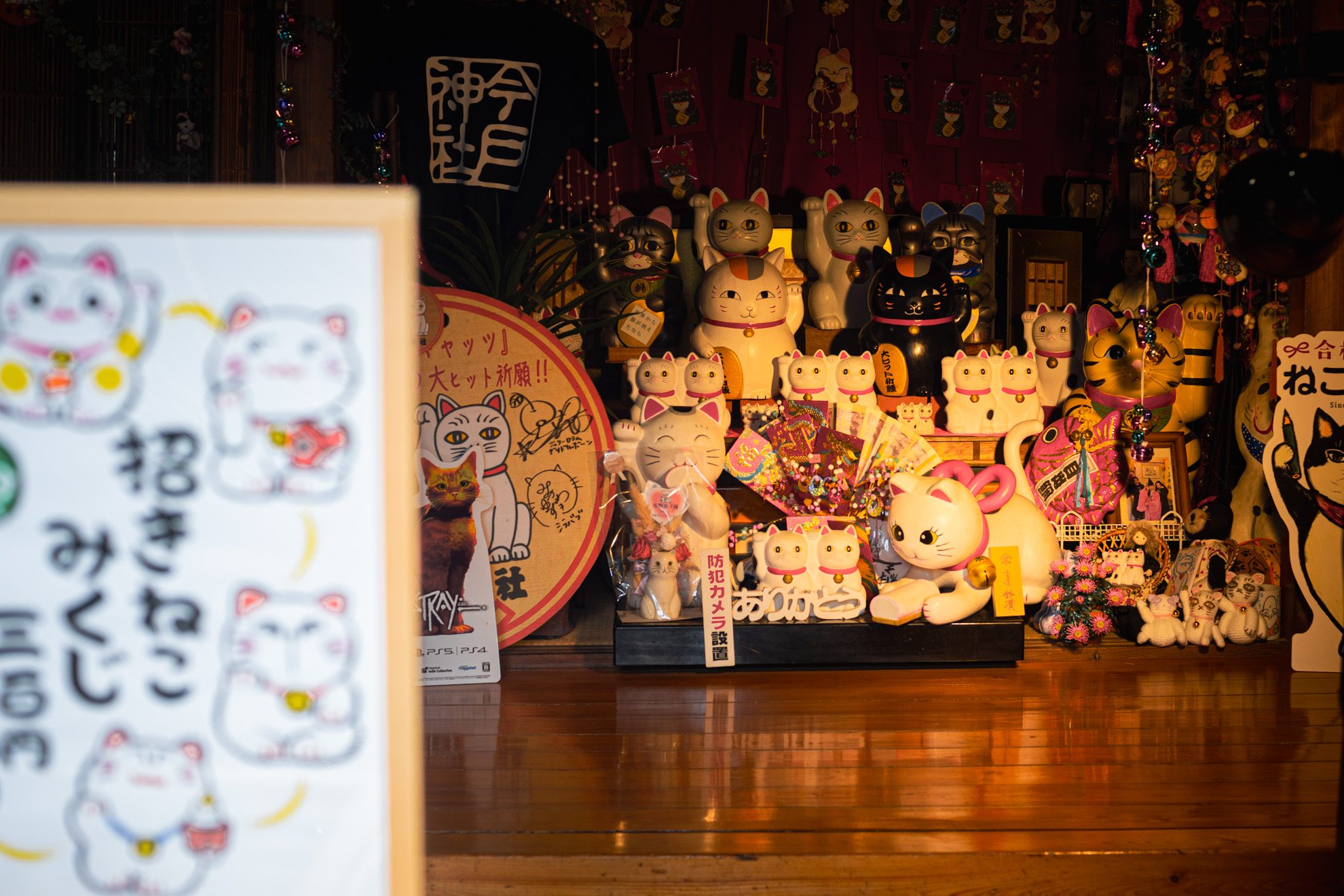 別にどっちが本物?なんて論じるつもりもありませんが、境内が重厚な雰囲気と一見してものすごい数の招き猫が並ぶ豪徳寺に比べると、こちらの招き猫はサイズも質感もデザインも違うとにかくいろんな猫をただ集めてきてそのへんに配置したような「猫の雑貨屋」みたいな感じ、ではあります。