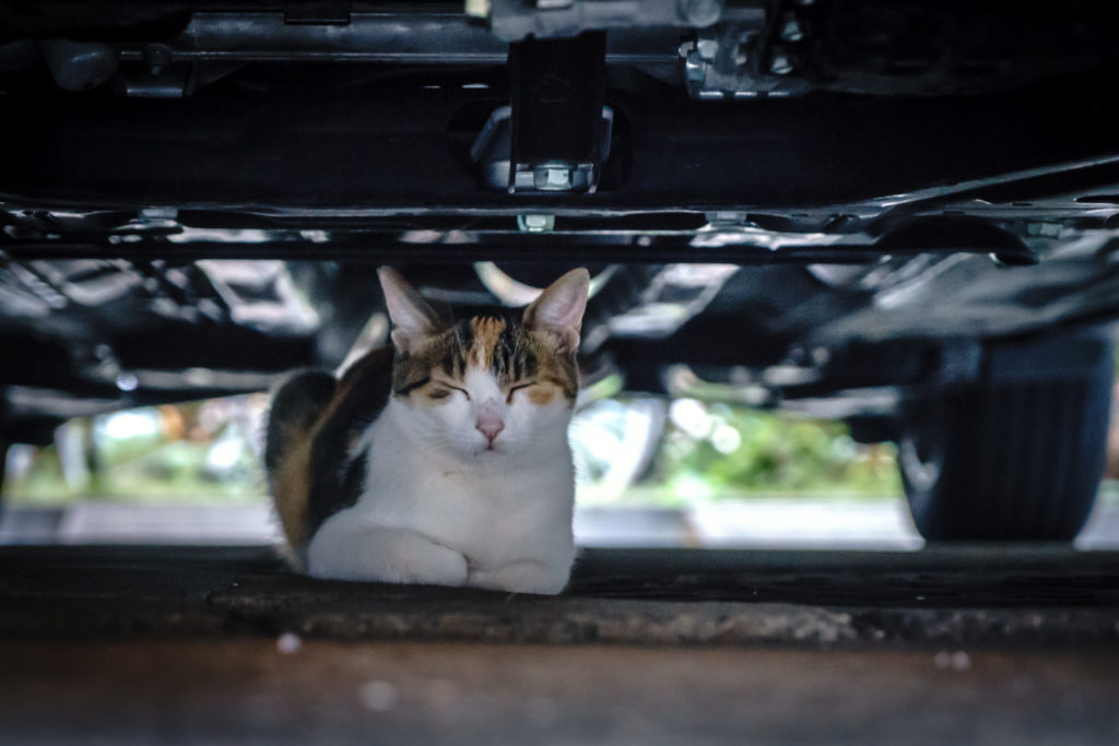 SONY α7 SEL2470Z F4 0.8秒 ISO3200 車の下にねこさんが陣取って動かないんです。写真は明るいですがほんとはだいぶ暗くなってまして、手持ちで0.8秒なんで微ブレしていますがこれが精一杯。 -