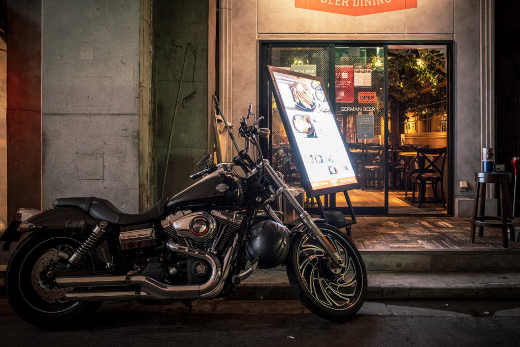 RICOH GRⅢ 1/20 F2.8 ISO640 通りすがり、バーの正面に止まっていたハーレー。やっぱバイクってかっちょええですよね。大昔ですが、バイクに憧れて今でいう普通二輪免許をがんばって取った過去を思い出します。