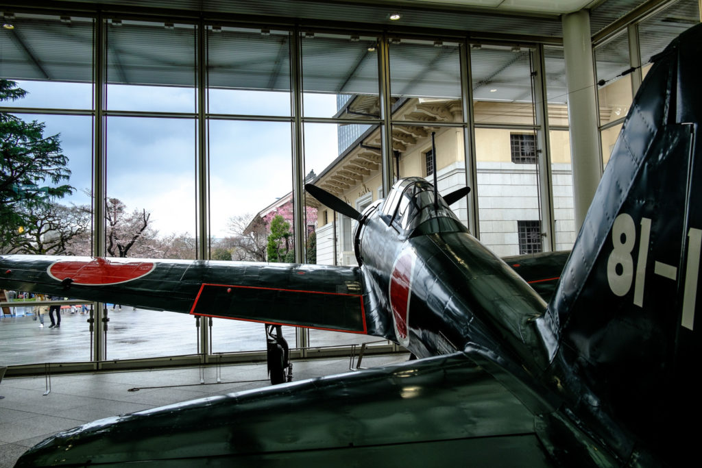 FUJIFILM X-M1 FUJINON XC16-50mmF3.5-5.6 OIS Ⅱ F5.6 1/280秒 ISO400 靖国神社に併設されている遊就館に展示されているゼロ戦です。ご覧の通り先頭部を窓側ぎりぎりに設置しているため、機体前部から狙ったのではプロペラしか写りません。このためすべて... -