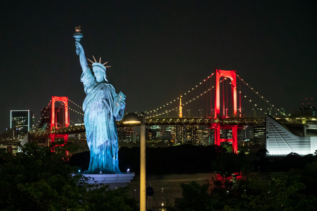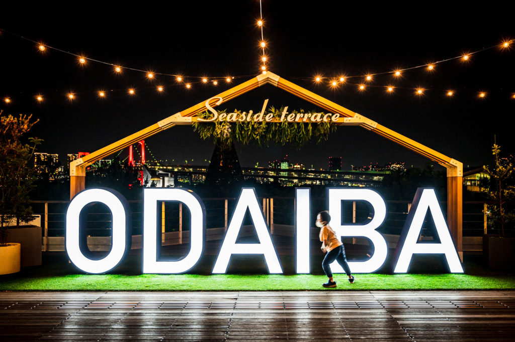 Nikon Z6 NIKKOR Z 24-70mm f/4S 1/30 F4 ISO800 東京アラートで赤くライトアップされたレインボーブリッジを背景に、お台場はデックス東京のシーサイドテラスを撮影。通りがかりの子供の姿がちょうどよいアクセントになりました。 -